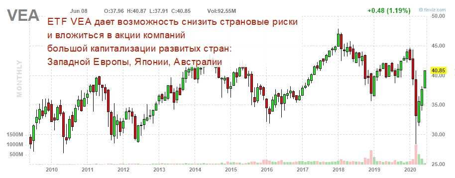 Фонд (VEA, основан 2007 г.) предоставляет возможность вложиться в акции большой капитализации не только американских компаний, но и развитых иностранных рынков, включая западную Европу, Японию и Австралию. Осуществляет следование за индексом MSCI EAFE Index.