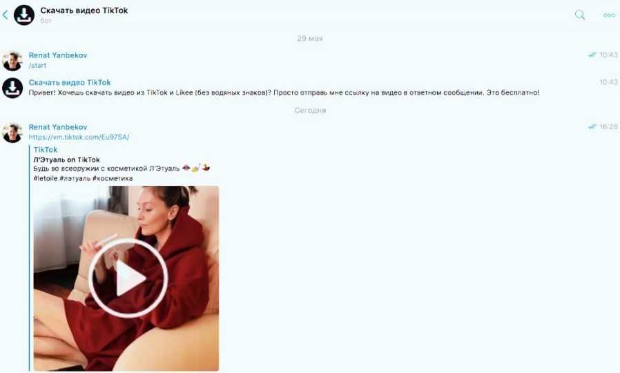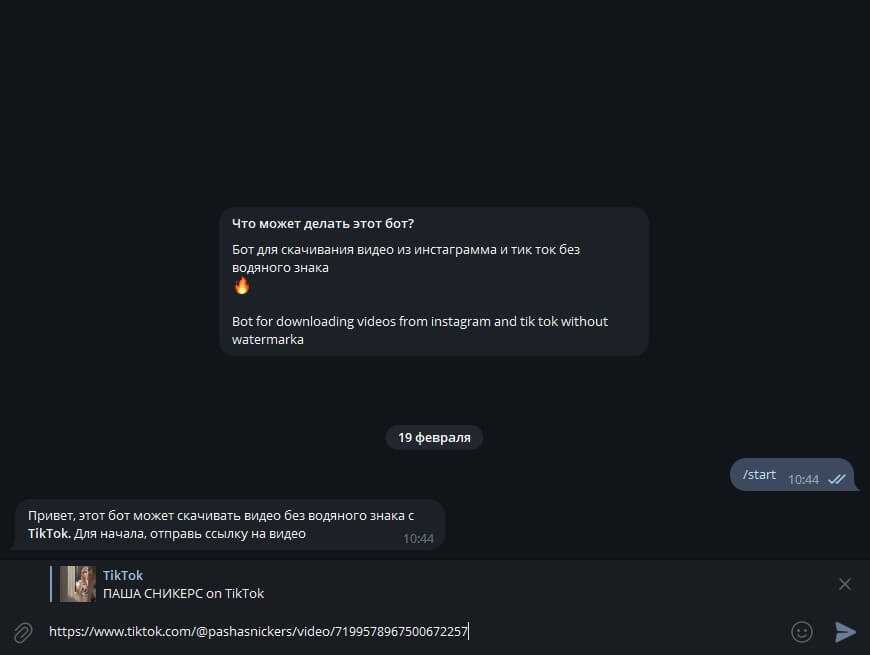 Без водяных знаков видеоролики выгружаются и в чатах с Telegram-ботами. Подходящих инструментов в мессенджере несколько – например, @ttsavebot или @TikTokXbot. Разница между ботами, как и в случае с плагинами и онлайн-сервисами, незначительная – те же функции, схожий интерфейс.