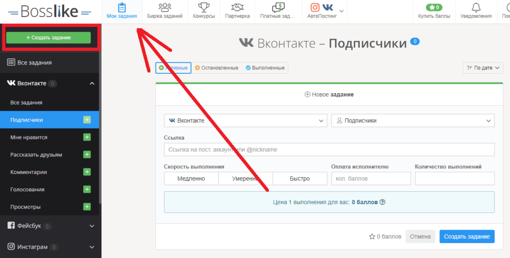 Большинство сервисов сделаны, как под копирку. В любом из них Вы можете сами выполнять задания (ставить лайки, вступать в группы, делать репосты, писать комментарии), зарабатывая балы и тратить эти балы, для накрутки лайков. Но есть возможность не тратить своё время, закинуть небольшую сумму денег — 100-200 рублей, и сразу же создавать задания по накрутке.