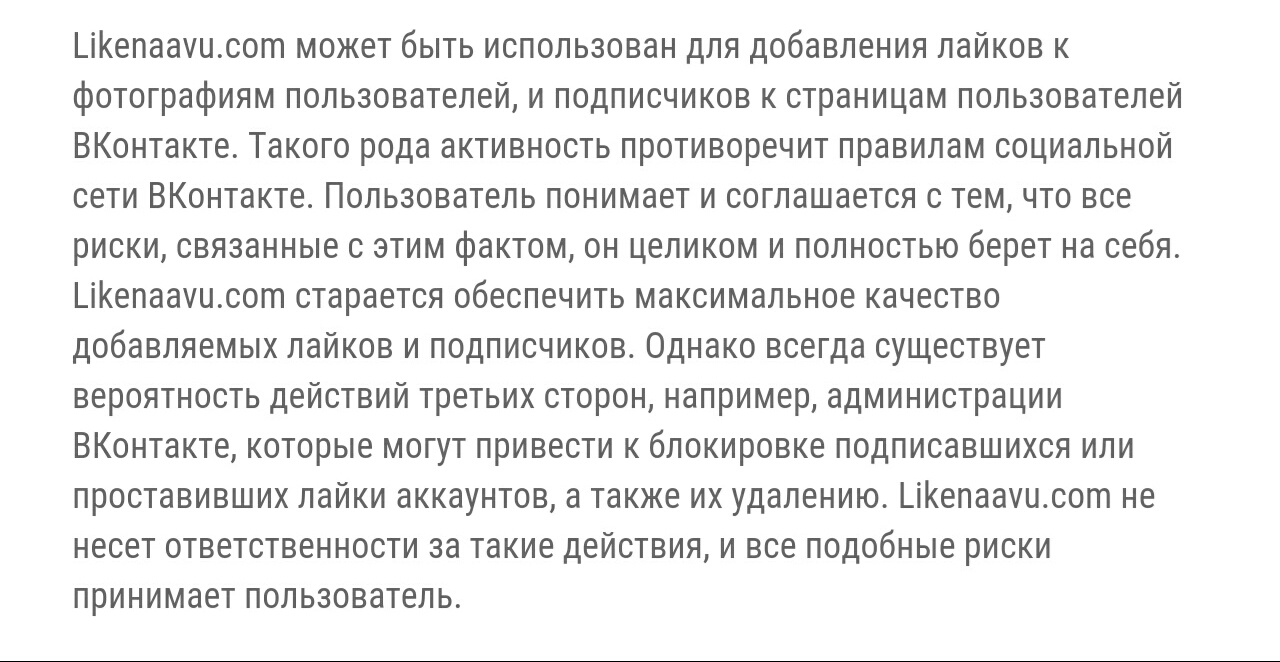 Однако, у такой массовой накрутки есть свои недостатки. Такая накрутка лайков незаконна с позиции администрации соцсети ВКонтакте, поэтому за нее можно получить баню, или лишиться аккаунта.