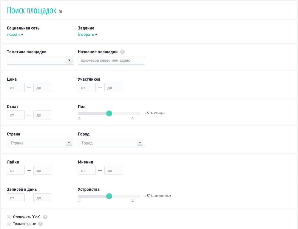 Подобрать площадки для размещения можно по тематике, адресу площадки, ключевому слову, цене, количеству участников, социально-демографическим характеристикам аудитории, охвату, среднему количеству лайков, мнений. Если вас интересует мобильная аудитория, вы можете указать % такой аудитории.