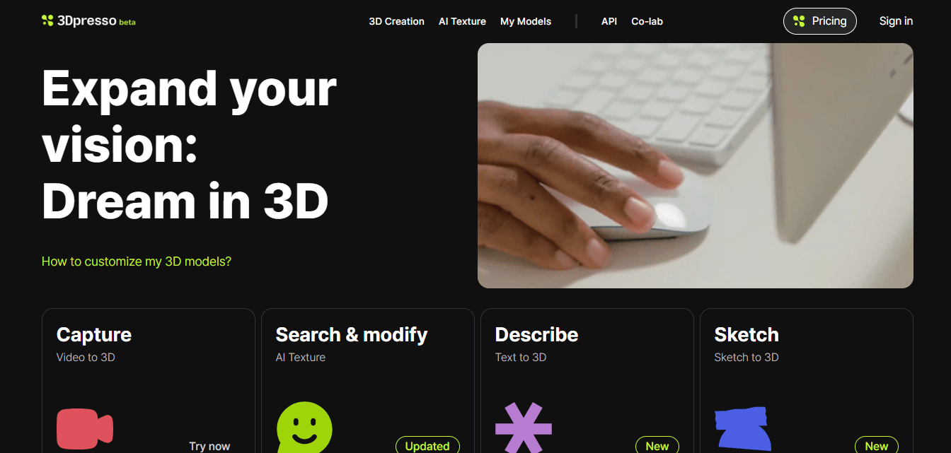 Advanced generative AI is harnessed by the cutting-edge online service 3DFY AI to produce high-quality 3D models from textual descriptions. By eliminating the need for costly, time-consuming, and impracticable manufacturing or scanning methods, 3DFY AI has made the creation of 3D content accessible to everybody. Instead, this service allows anyone to acquire the same high-quality 3D assets developed by professional modelers but for a much lower cost and in much less time. The primary objective is to eliminate the need for human labor in developing 3D content through automation, allowing users to generate an infinite amount of 3D assets at lightning speed. Independent creators and businesses can take advantage of this cutting-edge technology, as it provides them access to curated 3D databases of digital items or develops 3D virtual things based on written instructions.
