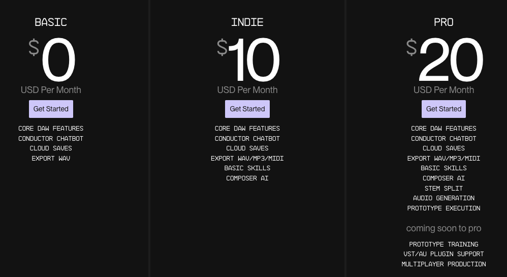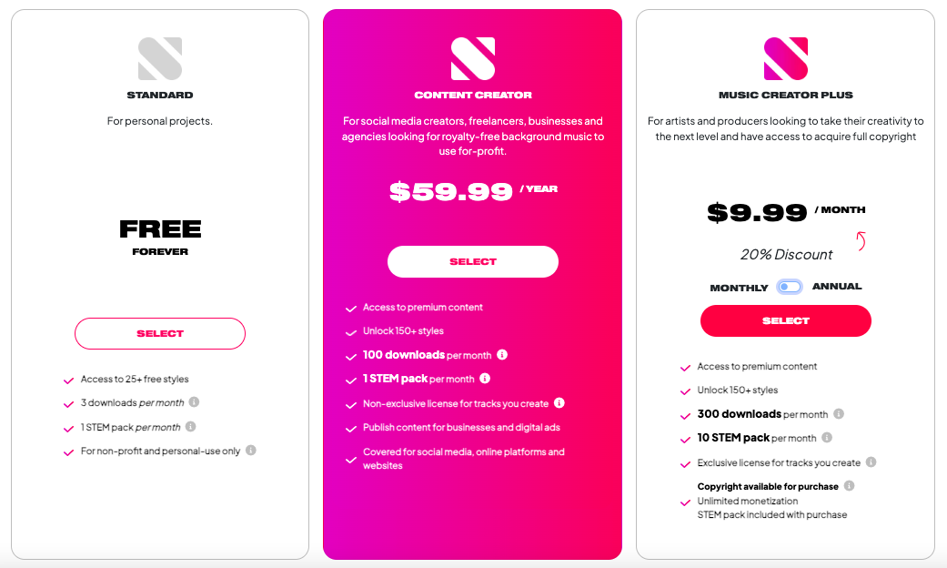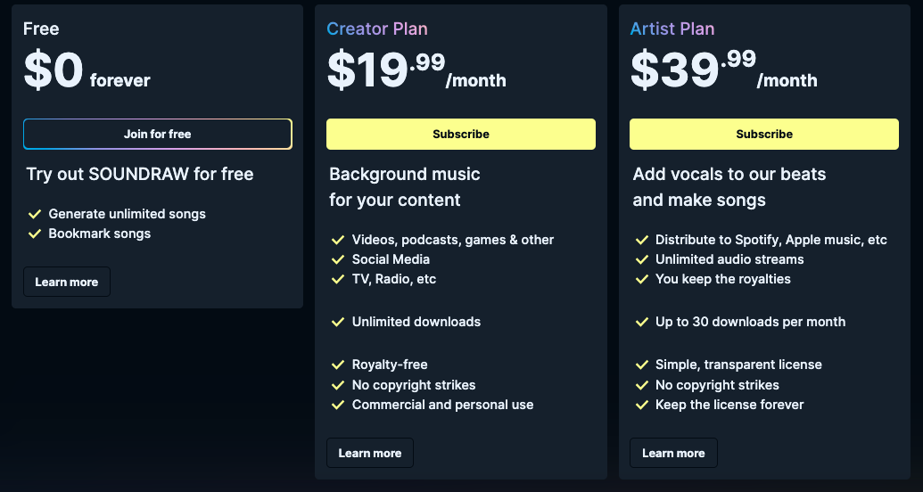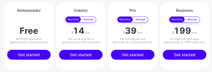 В потоке также доступны треки, сгенерированные другими пользователями. На тарифном плане «Free» можно генерировать до 25 треков в формате MP3. На плане «Creator» ($14 / мес.) можно генерировать и загружать до 500 треков в разных форматах. Оба плана дают возможность использовать музыкальные дорожки только для личных целей и NFT. На тарифном плане «Pro» ($39 / мес.) пользователь имеет до 500 загрузок во всех форматах. Использовать треки можно в личных и коммерческих целях.