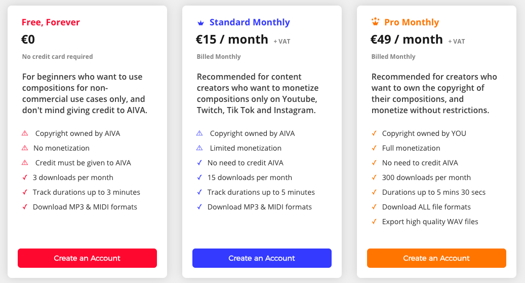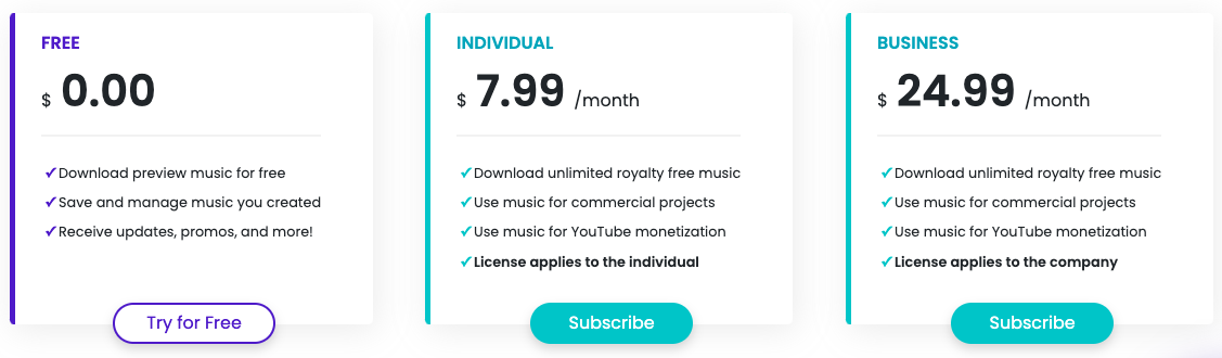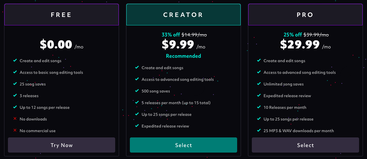 На тарифном плане «Free» можно загружать3 трека длиною до 3 минут в MP3 и MIDI форматах. Для загрузки большего числа треков нужно приобрести подписку. За €15 / мес. На плане «Standard» можно загружать до 15 треков длительностью до 5 минут в MP3 и MIDI форматах. Для работы с большими объемами музыкальных треков придется приобрести план «Pro». За €49 / мес. пользователь получит 300 дорожек длительностью 5 минут 30 секунд во всех доступных форматах.
