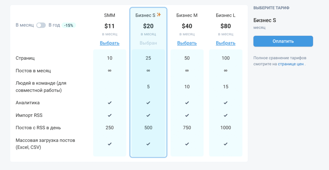 - Гибкий выбор тарифов по количеству учеток и социальных страниц.