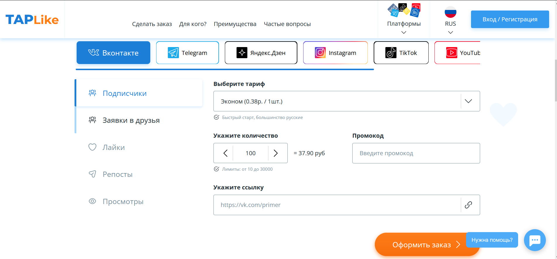 Сервис предлагает большое количество услуг по накрутке подписчиков и активности в социальной сети ВК. Можно накрутить: подписчиков, лайки, заявки в друзья, просмотры постов и видео, голосования и прослушивание плейлистов. Стоимость подписчиков, например, начинается от 0,49 руб, что довольно дешево.
