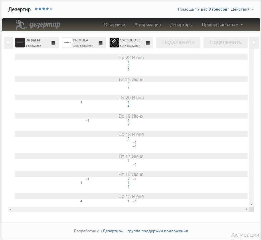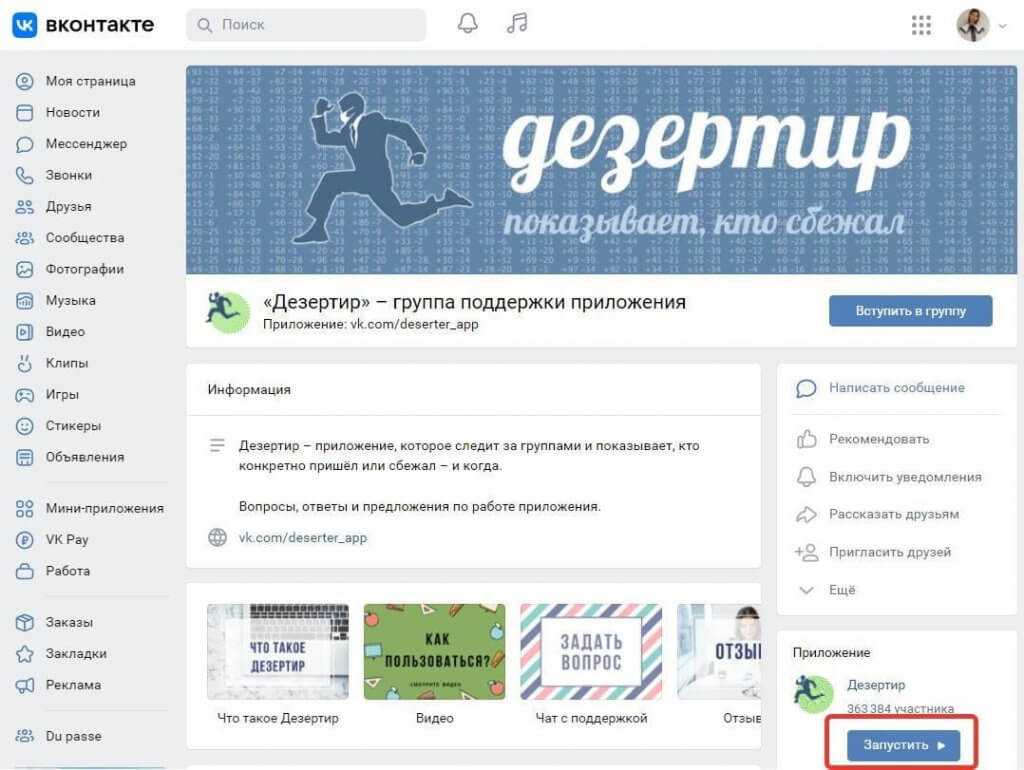 Это приложение позволяет подключить к отслеживанию несколько групп и регистрирует, кто подписывается на сообщество и кто из него выходит. Найдите в поиске сообщество “Дезертир” и запустите оттуда приложение. Бесплатной версии достаточно для мониторинга нескольких сообществ одновременно.