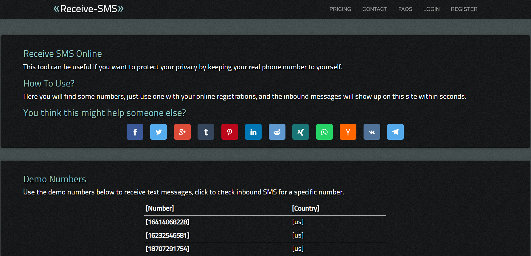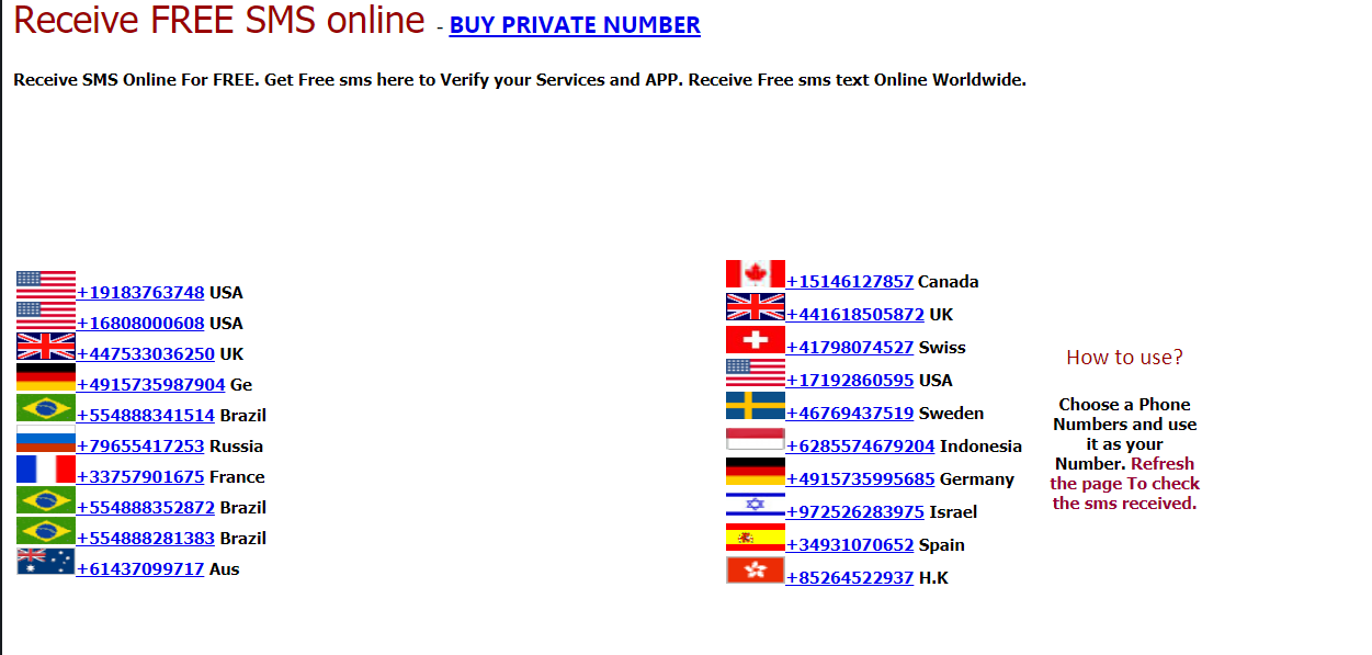 Веб-сайт SMS-receive содержит виртуальные и реальные телефонные номера, хранящиеся на SIM-картах. Сайт предоставляет пользователям бесплатную услугу с общедоступными телефонными номерами, где вы можете получать SMS-сообщения онлайн для доступа к различным Интернет ресурсам (сайтам и приложениям). Воспользоваться сервисом довольно просто — перейдите на главную страницу сайта SMS-receive и выберите виртуальный номер телефона из списка: