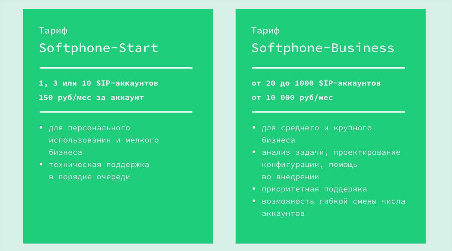 Предусмотрен тариф вообще без абонентской платы с достаточным набором опций. Нужно лишь приобрести номер телефона нужной страны или региона с ежемесячной оплатой.