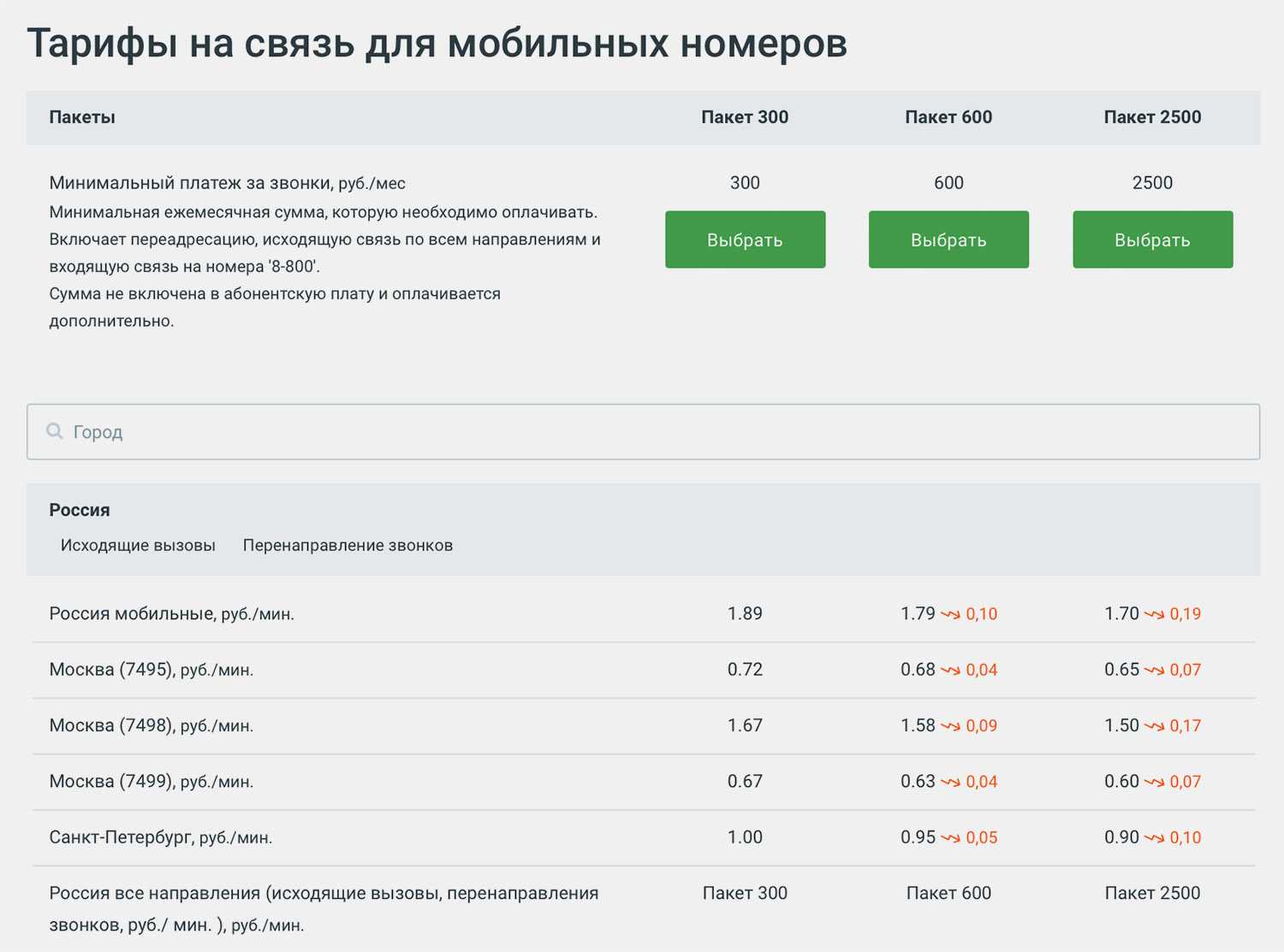 Предусмотрено два приемлемых тарифа с абонентской платой от 300 до 600 рублей в месяц. Предоплаченных минут в нем не предусмотрено, отличается лишь стоимость разговоров по разным направлениям. Чем больше абонплата, тем ниже стоимость минуты разговора.