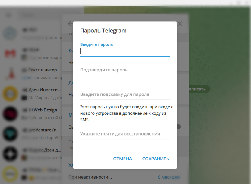 - Telegram – популярный облачный мессенджер для обмена сообщениями, звонками и видеосвязи. Для того чтобы включить двухэтапную аутентификацию, нужно ввести и подтвердить пароль, указать подсказку для пароля, которую нужно будет вводить в дополнение к коду из SMS. А еще нужно указать почту для восстановления пароля. В общем, все очень серьезно!
