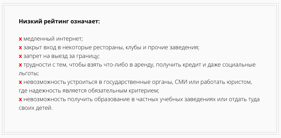 К примеру, у людей с низким рейтингом будет медленнее работать интернет, они не смогут посещать некоторые рестораны, клубы и прочие заведения. Им запретят свободно выезжать за границу. Рейтинг будет влиять на возможность взять что-либо в аренду, получить кредит и даже социальные льготы. Граждане с низким рейтингом не смогут устроиться на определенные должности, например, в государственных органах, СМИ или юриспруденции, где надежность, разумеется, является обязательным критерием. Если у вас низкий рейтинг, то вы не сможете получить образование в частных учебных заведениях или отдать туда своих детей.