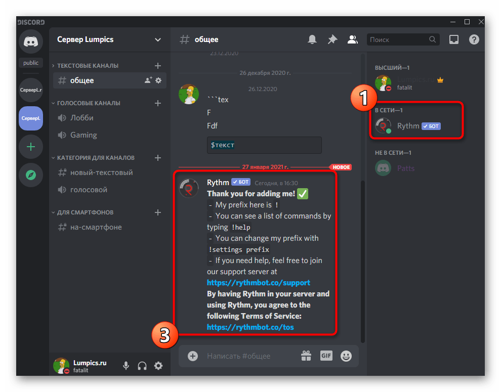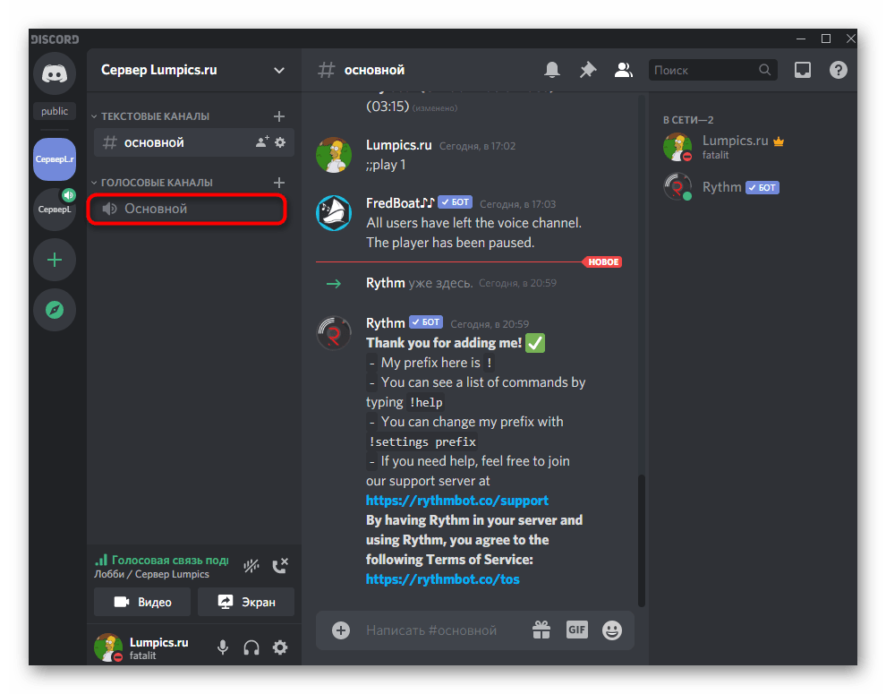 Все предварительные действия завершены, значит, можно приступать к включению музыки через добавленного бота. На этом же этапе разберем основные принципы взаимодействия с данным ботом, но только на одном примере.