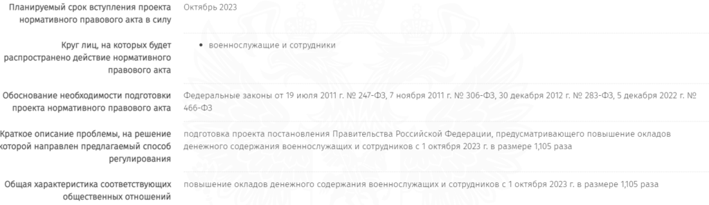 Что касается повышения довольствия, в свободном доступе есть , внесённый в начале 2023 года. Он предполагает повышение денежного содержания «военнослужащих и сотрудников»: