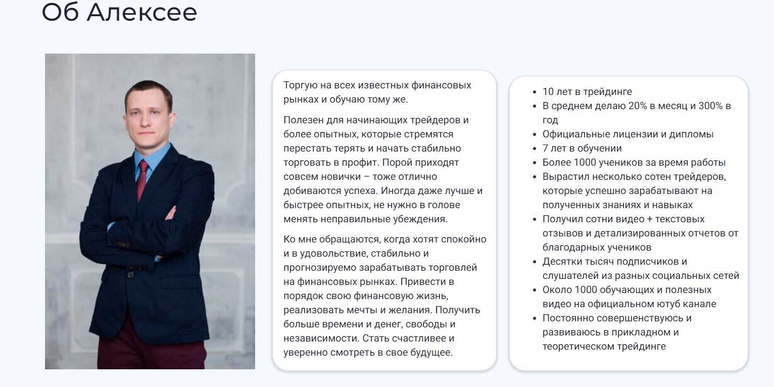 О себе молодой человек рассказывает, что работает на всех финансовых рынках и является автором курса. Материал может быть полезен не только новичкам, но и опытным игрокам. Опыт торговли более 10 лет, добивается прекрасных результатов, так, в среднем в год удается получить доход 300%.