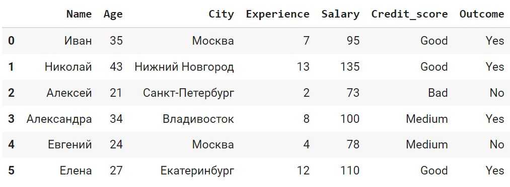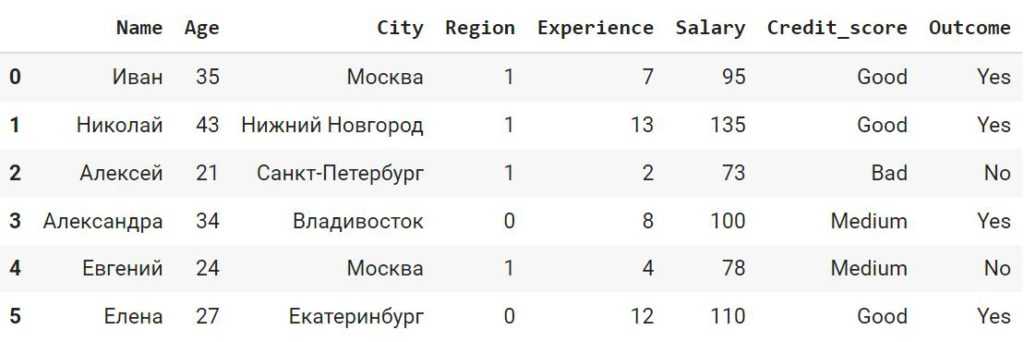 <class ‘pandas.core.frame.DataFrame’> RangeIndex: 6 entries, 0 to 5 Data columns (total 7 columns): # Column Non-Null Count Dtype — —— ————— —— 0 Name 6 non-null object 1 Age 6 non-null int64 2 City 6 non-null object 3 Experience 6 non-null int64 4 Salary 6 non-null int64 5 Credit_score 6 non-null object 6 Outcome 6 non-null object dtypes: int64(3), object(4) memory usage: 464.0+ bytes |