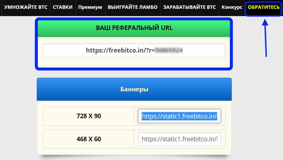 Для того, чтобы разместить реферальную ссылку на вашем сайте вам необходимо перейти на вкладку меню «REFER» (на русском — Обратитесь). И скопировать сгенерированную уникальную ссылку.