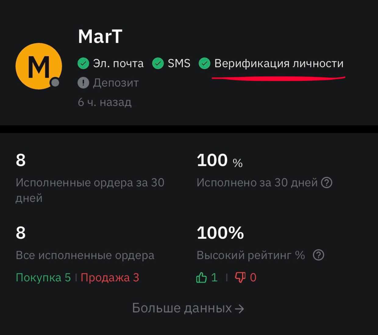 Уже после того, как отправил деньги, я ещё раз зашёл в его профиль, открыл «всю информацию» (то есть сделал аж два шага, спасибо, идиотский Bybit) и с ужасом увидел, что завершённых ордеров у вора 8, а вот сделок было ни одной. Полностью стало понятно, что произошло. И этот четвёртый красный флаг, который платформа не подсветила.