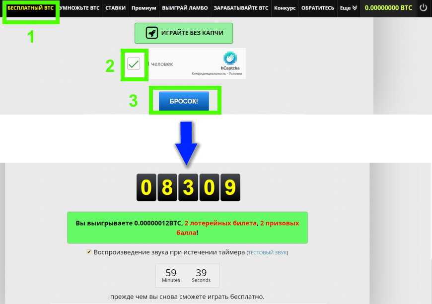 Как видите, нет ничего сложного, просто не забываем нажимать каждый час на «Бросок». Вы можете заходить на сайт с телефона и поставить звуковой сигнал, чтобы не забыть. Конечно, 12 копеек в час — это ни о чем. Но здесь на везение. Первая более или менее сумма (0,00001176 BTC) мне выпала уже в первый день после регистрации.
