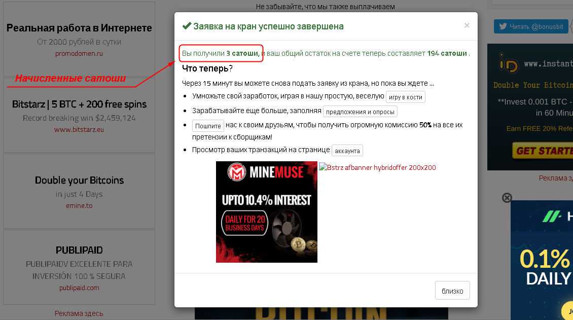 Периодичность зачисления средств зависит от ресурса. Здесь возможны следующие варианты — 5, 10, 30, 60 минут и так далее. Размер вознаграждения также различается. Одни сайты платят от 10000 сатоши, другие требуют дольше находиться на странице, но при этом выплачивают до 100000 монет. Формулировка «до» условна, ведь реальные выплаты на деле оказываются значительно ниже.
