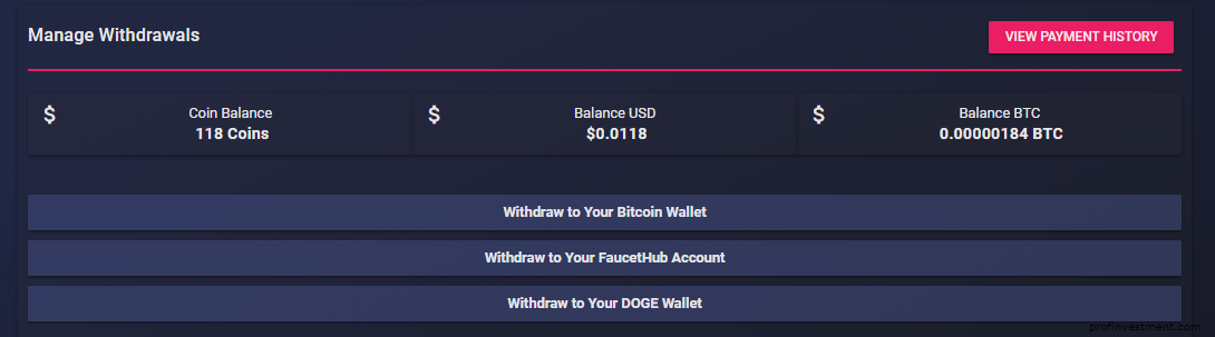 Минимальная сумма для вывода с крана на — 100000 Coins; на кошелек учетной записи в FaucetHub — 35000; для вывода на кошелек Dogecoin — 50000. Вывод на Биткоин происходит каждое воскресенье, через Dogecoin или FaucetHub — в течение 24 часов.