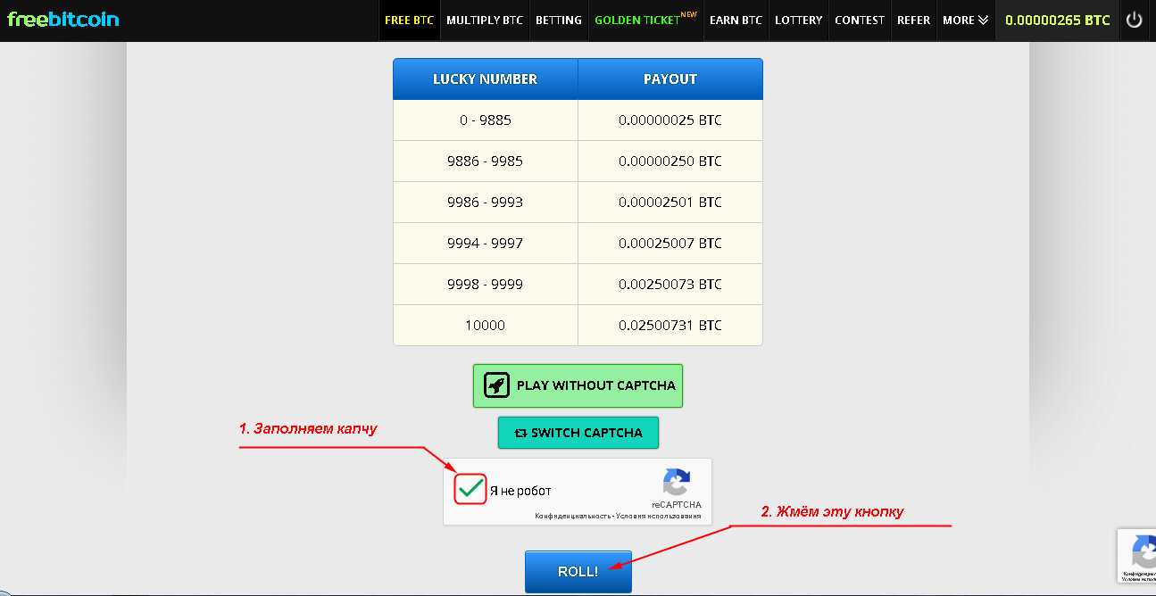 Интерфейс сайта простой и без навязчивой рекламы. Для получения бесплатных биткоинов нужно перейти в раздел “Free Bitcoin” и нажать синюю кнопку внизу страницу “Rolli”. В зависимости от выпавшего числа пользователь получит определенное количество Bitcoin: от 31 сатоши до 0,031BTC.