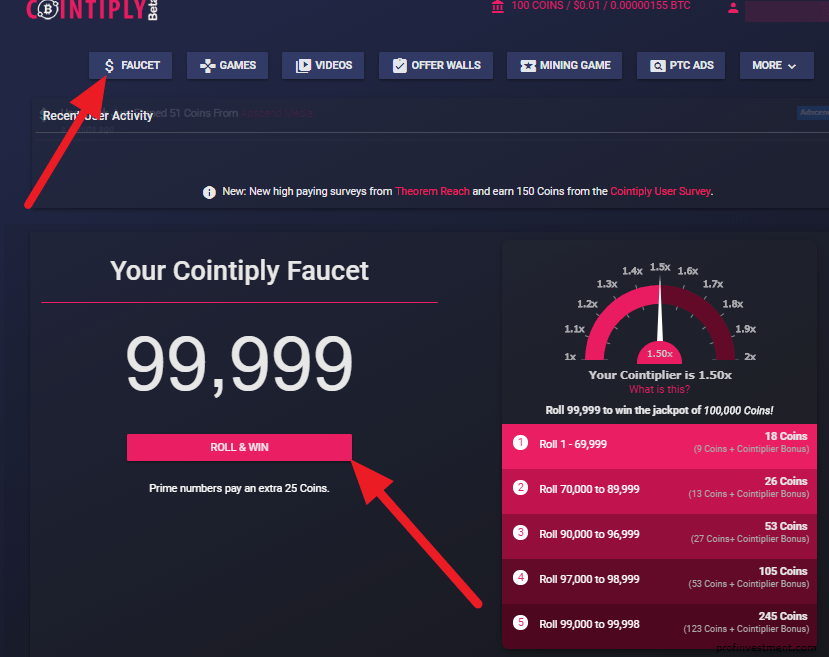Чтобы получить бесплатную валюту, перейдите в раздел «Faucet» и под надписью «Your Cointiply Faucet» нажмите «Roll@Win». В зависимости от выпавшего числа вы получите Coins согласно таблице справа.
