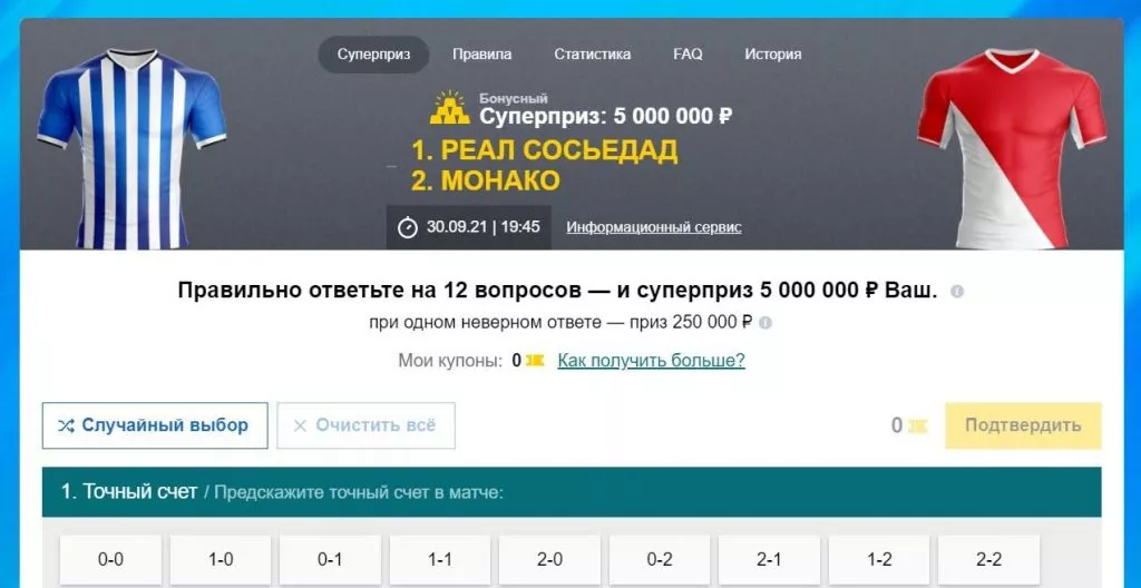 Чтобы беттору было проще составлять прогнозы и давать правильные ответы на поставленные вопросы, он может использовать инструмент «Статистика». Для этого нужно посмотреть на серый блок на странице акции, где указано, какой матч нужно проанализировать. В самом верху блока есть кнопки «Суперприз», «Правила», «Статистика», «FAQ», «История».