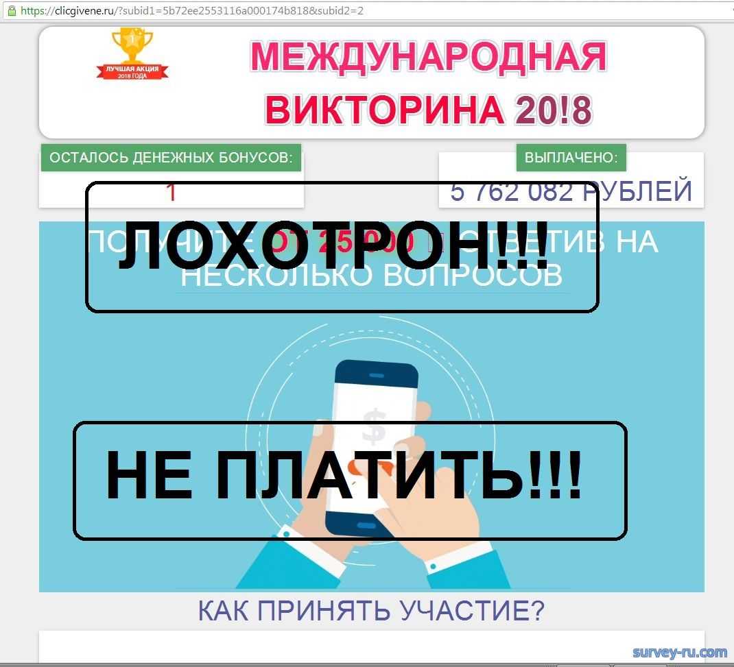 Основной фактор, подтверждающий, что Викторина 2018 лохотрон – тут любого считают призером и предоставляют для него большую сумму денег. Возможно, сделать много повторений – каждый раз проинформируют о крупном выигрыше. Не покупайтесь на эту аферу!