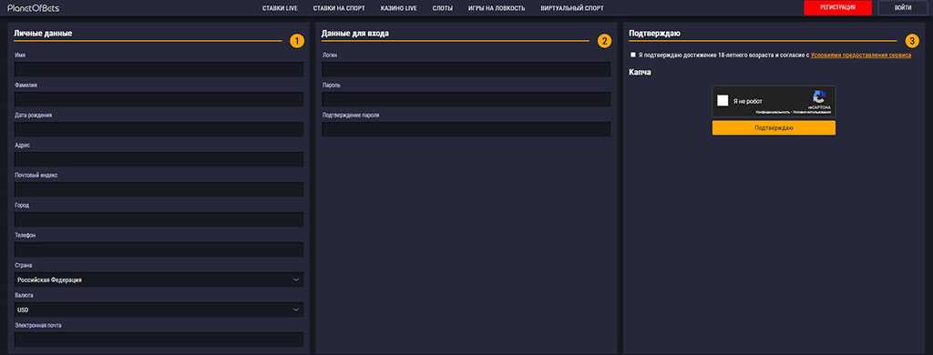 Процесс регистрации в букмекерской компании PlanetOfBets не вызывает вопросов. Для регистрации понадобится указать персональные данные и заполнить все поля анкеты.