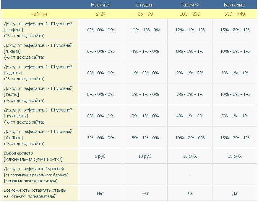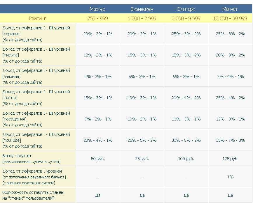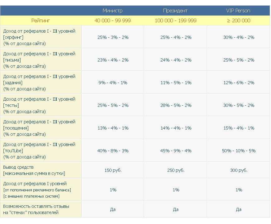 Отличная и приличная сетка из трех уровней. Рейтинг и статусы снова важны, так как повышают доход неимоверно: