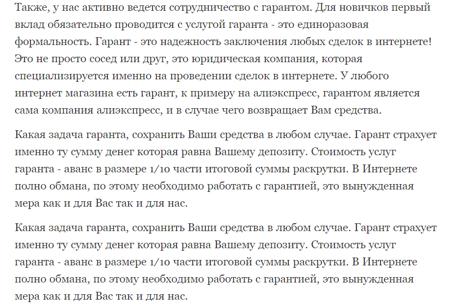 Важно! Мы уверены на 100%, что гарант принадлежит также этим мошенникам и все делается для того, чтобы как можно больше получить денег от обманутых людей.