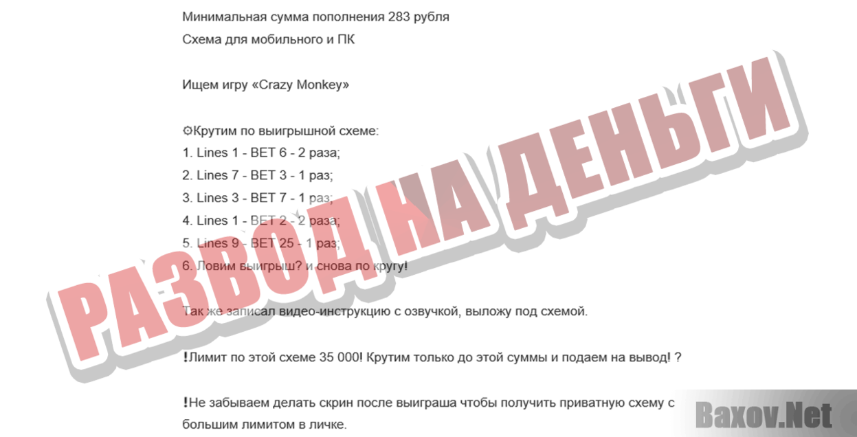 Далее пошла сама «выигрышная» схема, которая и оставит вас без денег. Ну и в самом конце есть видео-инструкция, которая открывается только с телефона (если вы когда-нибудь играли в бесплатное приложение игры Crazy Monkey, вы поймете, что данное видео именно снято на этом приложении), плюс монтаж, причем не очень качественный, в котором видны склейки. Кстати, если внимательно ознакомиться с текстом на странице, то можно найти грамматические ошибки.