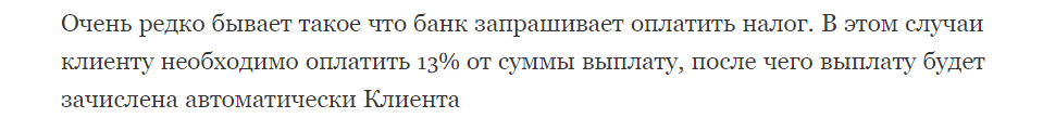 «Очень редко букмекерская контора может потребовать оплатить налог 13%». Ну, во-первых, букмекеры (оффшорные, легальные) не требуют никакой оплаты, а во-вторых, поверьте, вот именно с вас потребуют перевести 13%, так как это обычная схема мошенничества на многих нечестных аналитических ресурсах.