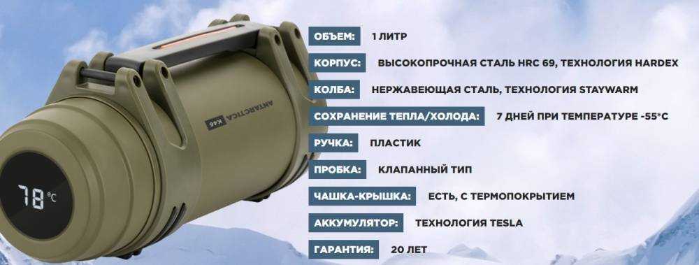 - Арктические термос ANTARCTIVA K46 сохраняет кипяток 7 дней в морозы до -55°C!