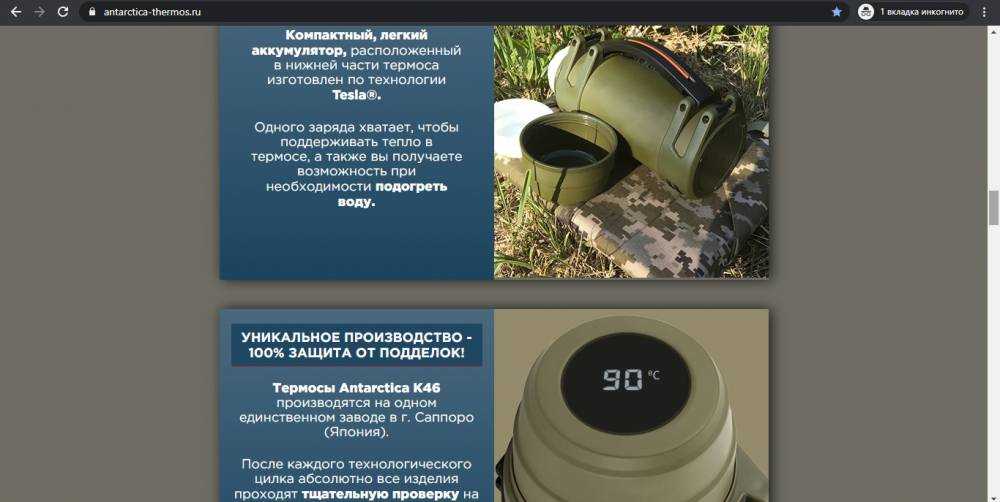 Во-первых, термоса ANTARCTICA K46 объёмом в 1 литр не существует. На картинке изображён термос украинского бренда M-Tac, объёмом полтора литра. Жулики просто в фотошопе заменили логотип.