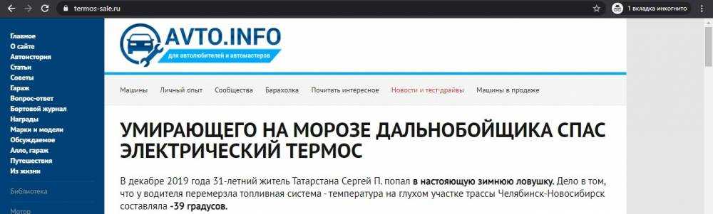 Сначала вас могут направить на поддельный сайт avto.info, где вам будут рассказывать байку про то как: УМИРАЮЩЕГО НА МОРОЗЕ ДАЛЬНОБОЙЩИКА СПАС ЭЛЕКТРИЧЕСКИЙ ТЕРМОС. Потом вы попадете на продающую страницу, где вам будут лить в уши про чудо термос.