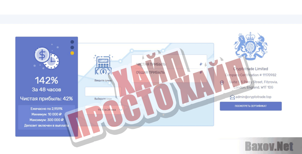 В данном случае мы имеем дело с криптовалютным хайп-проектом Cryptotrade, администрация и владельцы которого даже решили зарегистрировать реальную компанию на территории Великобритании, чтобы прикрыться ею.
