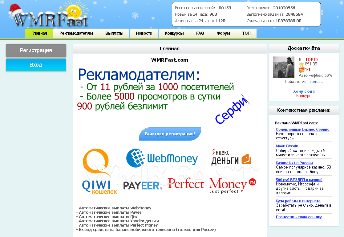 WMRFast – платит за объявления не более 1-4 копейки. Для увеличения дохода до 50%, необходимо брать на выполнение различные задания (регистрироваться в других местах, читать и копировать нужную информацию, т.д.).