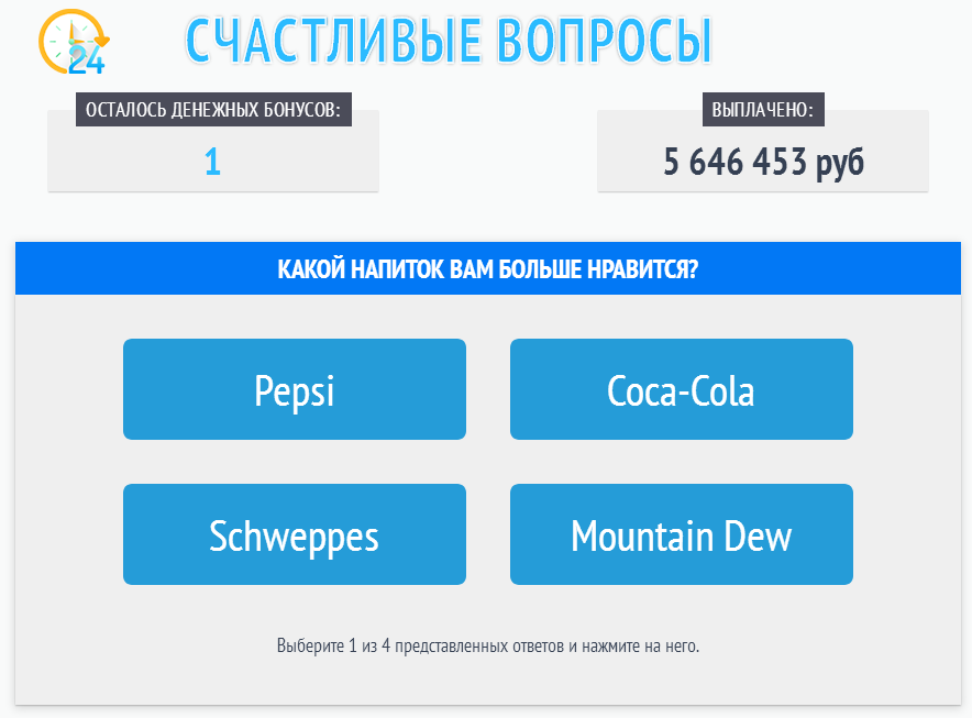 Что тут сказать? Это примитивный развод на 161 рубль. Очевидно, что никакие деньги вам не переведут. За что, хотелось бы спросить? За 6 ответов про любимую газировку? Ну это же бред! Это просто за гранью моего понимания! Кто в это верит? Ну покажите мне такого человека…