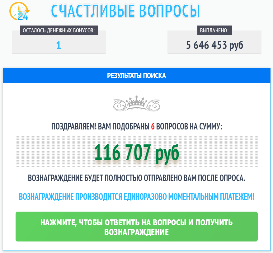 - Совершенно несоизмеримая оплата за какие-то примитивные и простейшие действия. Ну согласитесь, с чего ради кто-то будет вам платить более 100 тысяч за 6 дурацких вопросов? Ну кто это будет делать? Зачем ему это? Реальные проекты платят около 100 рублей за опрос и ничего закреплять вашими деньгами не просят.