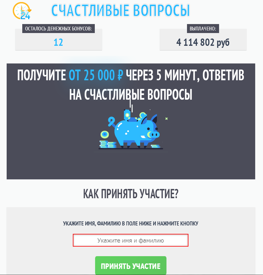 Далее я должен указать свою фамилию, чего делать, естественно, не собираюсь. В этом поле можно вписать что угодно, значение не имеет. Вбил туда свою счастливую по жизни цифру «7» и нажимаю на кнопочку «принять участие». Ух ты, сработало, уже настораживает и попахивает явным лохотроном. Что будет далее? А вот что: