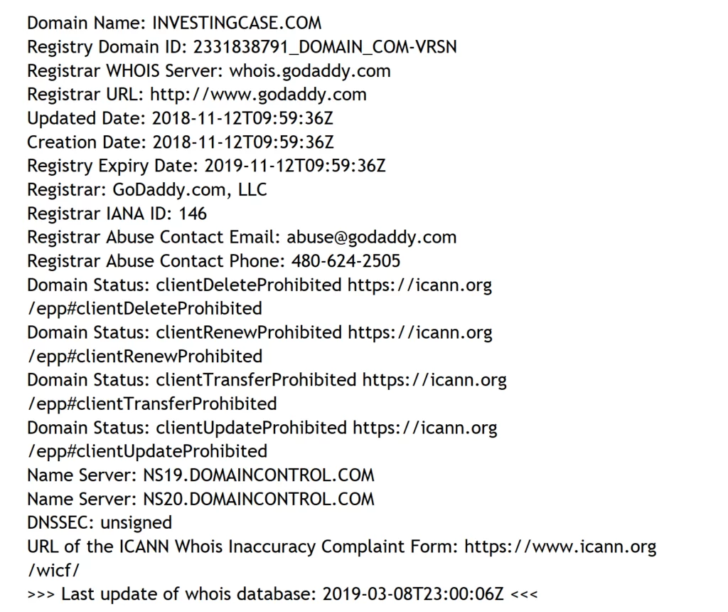 Как видно выше 100% сходство. А это означает, что перед нами все те же мошенники, только перебравшиеся на другой домен. И домен investingcase.com зарегистрирован только 12 ноября 2018 года:
