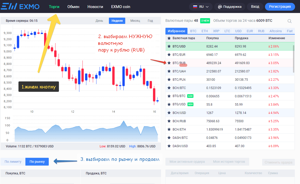 Биржа Exmo в отличие от Yobit представляет более скромный набор криптовалют, но зато имеет не несколько порядков лучшую репутацию. Ввод и вывод рублей на Exmo возможен только после полной верификации аккаунта. Данная криптовалютная биржа позволяет вывести криптовалюту в рубли, используя различные способы. Здесь вам нужно будет также перевести какую-либо цифровую валюту на счет данной биржи и после зайти в раздел «Торги». Там выбираете соответствующую валютную пару ХХХ/RUB, где ХХХ — ваша криптовалюта.