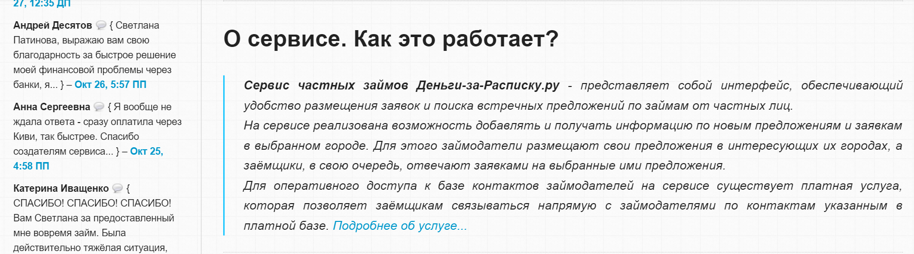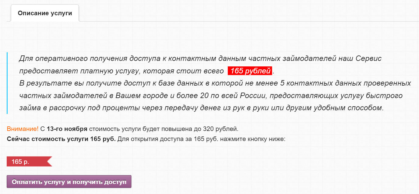 Первоначально он позиционируется как сервис, где вы можете купить контакты частных кредиторов в вашем городе.