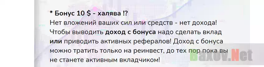 Если вы думаете, что 10 баксов вам переведут на ваш кошелёк, то спешу огорчить. Этот бонус нужен для запуска так называемой скорости начислений. Что это значит? Для участия в проекте необходимо пополнить баланс личном кабинете. Вложенные деньги превращаются в скорость наращивания баланса для вывода средств на кошелек. Но чтобы выводить доход с бонуса надо сделать реальный вклад или приводить активных рефералов! Доход с бонуса можно тратить только на реинвест до тех пор, пока вы не станете активным вкладчиком. Такие вот условия.