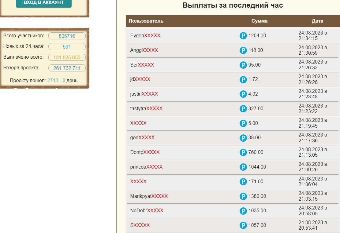 - статистика проекта рассказывает, что в игре 20629 зарегистрированных пользователей, пополнивших баланс на общую сумму 4171843 рублей, получивших выплат на общую сумму 681754 рублей;