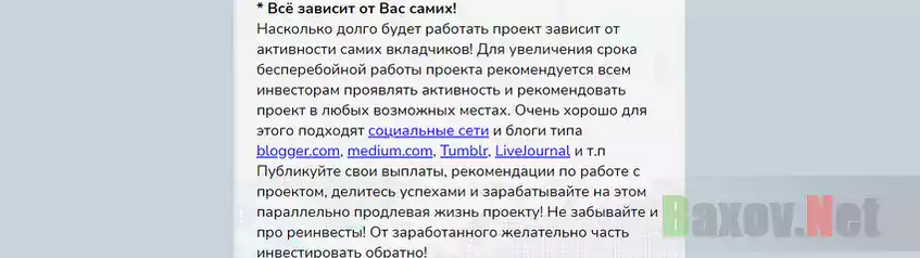 Сколько будет работать проект? Со слов негодяев, пока касса лохотрона не опустеет. Прохиндеи уверяют, что всё зависит от активности вкладчиков. Чем больше будет денег и рефералов, тем лучше. Кому лучше? Жуликам?