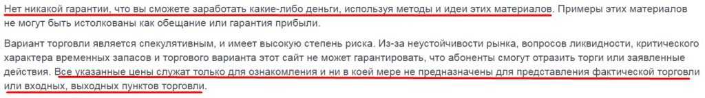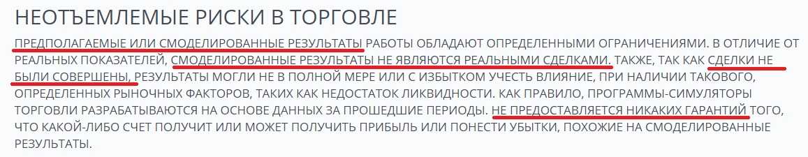 Как видите, здесь тоже никто и ни за что ответственности не несет. Более того, все результаты и обещания не имеют ничего общего с реальностью и это никто не скрывает. Вам прямо говорят, что результаты работы этой «прибыльной» программы были смоделированы и не имеют никакого отношения к реальности.