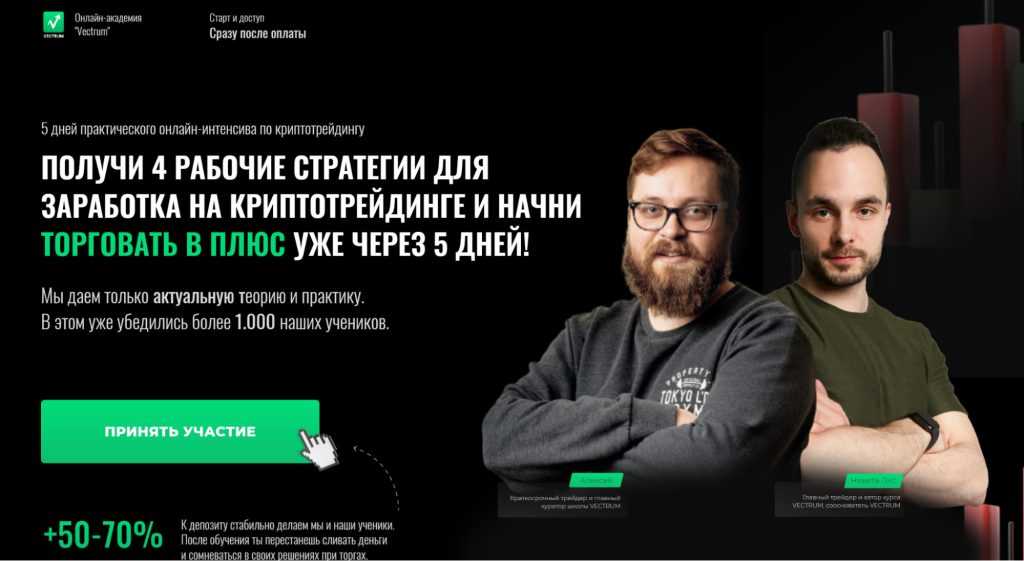 Никита Лис и Глеб Шатерник предлагают услуги собственной онлайн-академии. На момент написания обзора они дают пять практических онлайн-интенсивов по криптовалютному трейдингу и четыре якобы рабочие стратегии. Заявляют о возможности торговли в “плюс” уж спустя пять дней после начала учебы.